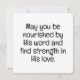 Partagez un message de nourriture spirituelle avec la carte de voeux "Nourri par la Parole". Avec l'image d'une Bible ouverte à côté d'une miche de pain, cette carte capture magnifiquement l'essence de "L'homme ne vivra pas seul par le pain, mais par chaque parole de Dieu." Parfait pour toutes les occasions, cette carte transmet un puissant message de foi et d'équilibre. À l'intérieur, les mots "Puissiez-vous être nourris par Sa parole et trouver de la force dans Son amour" ajoutent une touche de coeur à vos sentiments.