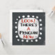 Un dessin typographique irrévérencieusement bizarre qui dit "Regarde ! Il y a un pingouin maintenant". Il présente du texte noir et rouge sur un rectangle blanc avec des points blancs amusants et amusants qui l'entourent, le tout sur un arrière - plan gris.