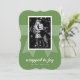 Cette élégante carte de vacances à photo unique avec un motif de ruban et les mots "emballé dans la joie" ravira votre famille et vos amis. La forme et la couleur de fond sont personnalisables. Fait partie d'une collection de Parcel Studios.