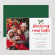 Une élégante et chic, simple, carte de Noël de changement d'adresse de famille avec un modèle pour une photo, présentant un petit élément botanique hivernal : une branche de houx rouge et vert de Noël. Une belle carte botanique de Noël pour annoncer notre déménagement que vous pouvez personnaliser avec votre/vos nom(s), l'année et une photo de famille (ou photo d'enfants etc.).