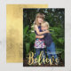 Le scintillement fantaisiste des étoiles et le mot croire, une représentation sentimentale et fidèle de l'esprit de la période des Fêtes et de Noël. Express votre foi dans la magie et le miracle de Noël avec ce magnifique design imprimé effet or vacances design. Modeste, riche, élégant et sophistiqué, tout comme la feuille d'or sur le cadre d'un tableau antique ou une tasse de thé dainty, ce joli carte photo typographique "croire" a l'air élégant et adorable.