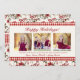 Un motif floral hivernal traditionnel classique composé de poinsettias rouges, de baies et de verdure, avec une bordure à carreaux rouges, constitue l'arrière-plan de cette carte qui présente 3 photos sur le devant, avec de la place pour votre choix de salutation principale, ainsi qu'une deuxième ligne de salutation et une ligne pour les noms, la date ou une citation favorite. La carte intérieure présente le même motif floral avec de la place pour 5 photos et une ligne de texte ou une date.