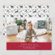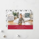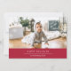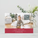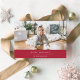 Cette carte de vacances photo moderne, simple et minimaliste met en vedette votre photo préférée au format horizontal ou paysage avec une bordure inférieure rouge canneberge festive. Votre message personnalisé apparaît dans une police blanche moderne (illustrée par "Joie au Monde"), avec votre nom de famille ou vos noms en dessous. Un motif subtil de flocons de neige est superposé sur les bords de votre photo pour un attrait festif. Les cartes sont au verso avec un motif hivernal de forêt avec des rennes et des flocons de neige en gris foncé sur fond blanc.