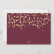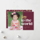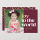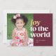 Cette carte de vœux photo de vacances festive présente la phrase "Joie au monde" écrite en typographie dorée et blanche sur un fond grenat rouge riche. La conception de typographie audacieuse se chevauche légèrement avec la photo pour une mise en page unique. Personnalisez avec votre photo préférée, vos noms et l'année de vacances. Le verso présente des confettis dorés festifs sur un fond de ton rouge bijou.