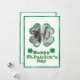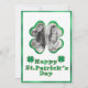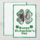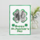 Cette carte de vœux personnalisée de St. Patrick présente un cadre photo de trèfle chanceux. Le cadre présente un design à paillettes dorées et à feuille verte. Un exemple de photo est placé à l'intérieur, que vous pouvez personnaliser pour inclure votre propre photo ou autre image. Le vœu Joyeux St. Patrick est imprimé dans une police pétillante assortie de feuille verte et de paillettes dorées. Deux trèfles sont placés de chaque côté.
