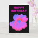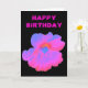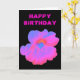 Cette carte de voeux lumineuse présente une photo d'une fleur de Nasturtium. La photo a été colorée artificiellement, ce qui donne une fleur rose vif avec quelques tons bleus mélangés. L'arrière - plan noir offre un beau contraste. Il y a du texte rose personnalisable au-dessus de la fleur, à l'extérieur de la carte, qui dit "Joyeux anniversaire" mais peut être changé pour d'autres occasions. L'intérieur de la carte est vide.