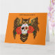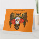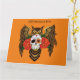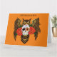 Un grand hibou brun à cornes avec un jour de crâne de sucre mort et le soleil de roses rouges sur fond d'orange