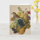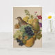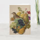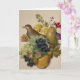 Un oiseau repose sur du raisin et des poires aux couleurs de l'automne avec des fleurs contre un arrière - plan d'or. Les feuilles d'automne colorées sont mélangées partout.