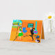 Cette carte de vœux personnalisable "Happy Retro Parents" montre une maman et un papa exultant tandis que leur enfant se précipite vers le bus scolaire. Le duo en liesse se trouve dans leur salon des années 60, de style moderne du milieu du siècle. La décoration orange est tout sauf discrète. Il y a du turquoise, une cheminée conique et une chaise œuf bleue lumineuse contre un mur de pierre orange. Sur le mur, il y a une impression sur toile tendue "Mid Century Modern Globe Art", disponible dans la propre boutique Zazzle de StrangeLittleOnion. Sur le sol, il y a un tourne-disque portable bleu et noir avec plusieurs albums vinyles éparpillés à proximité. Papa porte un costume noir avec une chemise de soirée bleu clair et une cravate bleu foncé. Il sort tous ses meilleurs mouvements de danse - ceux qui feraient rouler les yeux des juniors. Maman porte une robe verte vibrante et un tablier blanc à volants avec une garniture bleue. Elle se tient debout devant des portes vitrées coulissantes, agitant joyeusement la main tandis que son enfant descend l'allée vers le bus scolaire jaune qui attend. À travers les portes, on peut voir leur pelouse de banlieue parfaitement manucurée et la clôture blanche proverbiale. Même l'arrière-plan a l'air heureux avec un ciel turquoise et les silhouettes de cèdres. L'intérieur de la carte a un fond orange avec deux explosions d'étoiles jaunes entourant les mots