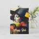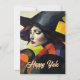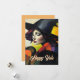Une carte de Yule et Solstice d'Hiver représentant une sorcière aux cheveux roux et au chapeau noir. Le recto indique : Joyeux Yule. Le verso indique : Et Solstice d'Hiver. Il s'agit d'une carte plate, recto-verso.