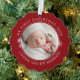 Modern keepsake baby's first Christmas personalize paper ornament in curve letters and line art of snowflakes overlaying a festive red with your favorite photo.