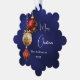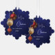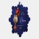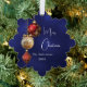 Un arrière - plan bleu marine, de couleur inégale. Décoré de baubles rouges et dorés, un peu de verdure et un cône de pin. Personnalisez et ajoutez votre nom, année. Texte : Joyeux Noël