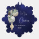 Un arrière - plan bleu marine, de couleur inégale. Décoré de baubles blancs et dorés, un peu de verdure et un cône de pin. Personnalisez et ajoutez votre nom, année. Texte : Joyeux Noël