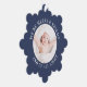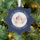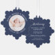 Faire-part de naissance bleue mignonne pour la période des fêtes de Noël qui est à la fois une carte de voeux et un ornement en papier de conservation. Le devant présente la photo de votre bébé et "We're Merry & Bright, And Up All Night" dans la typographie blanche moderne. À l'arrière, ajoutez leur nom et leur état de naissance, ainsi que votre salutation customisée et vos noms de famille.