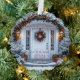 Belle porte d'entrée des fêtes blanches avec une belle couronne de Noël, ornée d'ornements argentés et rouges, et d'un ruban de satin rouge. La porte est entourée d'une verdure magnifique et d'une arche de baies rouges, des couronnes de cannes à sucre sont suspendues dans les fenêtres latérales et de jolies lumières de porche accueillantes et chaudes. Personnalisez pour quelqu'un de spécial.