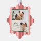 Petites rayures verticales crème et rouge corail donnent à cette carte de style ornement de Noël deux photos une ambiance moderne et chic lorsqu'elle est jumelée avec des polices classiques en vert de forêt. Le backer coordonné comprend un message plus long personnalisé de soutien et de mise à jour pour l'année qui est parfait pour envoyer à des amis et à la famille.