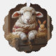 Cette illustration pleine de chaleur représente un mouton blanc moelleux portant un foulard tricoté coloré, niché dans le foin dans une caisse en bois rustique à l'intérieur d'une grange. Un mignon lapin brun regarde derrière les moutons. Des fleurs sauvages colorés et des feuilles d'automne ornent le premier plan, créant une scène charmante et cosy.