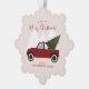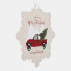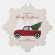 Illustration fantaisiste d'un vieux camion rouge de mode portant un arbre de Noël. Personnalisez ce design avec votre photo de famille préférée et un message personnalisé.