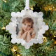 Modèle photo en forme de flocon de neige élégant et unique avec bordure en parties scintillant d'or sur une texture en marbre blanc avec veines brillantes d'or et flocons de neige blancs. Le verso comporte des graphiques arrière - plans complémentaires et des champs de texte modifiables.