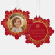 Carte d'ornement de Noël rouge, en forme de flocon de neige, avec votre photo personnalisée à l'intérieur d'une bordure d'éclatement de soleil rétrograde et doré (image imprimée, pas de véritable feuille). Texte personnalisable à l'arrière.