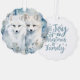 A woodland animal set of Christmas ornaments, all in blue with a blue text on the back