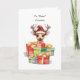 Le cerf porte un chapeau de Père Noël jaunâtre, dégageant une élégance ludique qui capture l'esprit de la saison. Autour du cerf se trouvent des monticules de cadeaux aux couleurs vives, formant une cascade colorée de joie et d'excitation. Carte parfaite pour envoyer vos cousins cette saison des fêtes.
