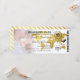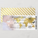 Billet de mariage carte d'embarquement avec une photo du couple heureux, une carte du monde de destination en feuille d'or, boussole, avion et un modèle de mariage personnalisé.