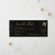 Carte d'embarquement Sauvegardez la date Carte d'avion Billet en Noir et Faux Gold Foil avec un design moderne minimaliste élégant avec notre avion amusant et unique avec un motif centre coeur, en noir et or, mais tous les textes, lignes et couleurs arrière - plans sont modifiables afin que vous puissiez créer votre propre design en utilisant ce modèle pour une carte d'embarquement rétro moderne qui a été conçu avec une destination mariage ou thème de voyage mariage ou anniversaire en tête. Visitez la collection de concepteurs de destinations de raisins papier pour coordonner les articles.