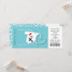Une faire-part de mariage amusante mais élégante dans un style carte d'embarquement/billet pour les couples se mariant à l'étranger Espagne qui est montré dans une silhouette carte blanche sur le bleu turquoise avec coeur d'amour rouge sucré, silhouette d'avion et forme de coeur tourbillonnant. Le revers est facile à customiser avec vos détails personnels et a un joli motif en dentelle fleurie blanche. Idéal pour les mariages de la ville espagnole et de la plage côtière.