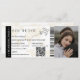 Carte d'embarquement de mariage à monogramme minimaliste moderne avec un fond blanc et marron simple, une photo du couple fiancé, un avion avec une traînée en boucle et un modèle de sauvegarde de date facilement personnalisable. N'oubliez pas de changer le texte au dos du monogramme.