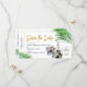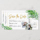 Carte d'embarquement pour mariage sur la plage tropicale avec un design moderne et fantaisiste de feuilles de palmier et une police de caractères tendance, comprenant de nombreux champs de modèle personnalisables, des photos, des informations de voyage et un générateur de code QR personnalisé au verso de la carte.
