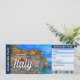 Faites une surprise à quelqu'un de spécial avec cette carte d'embarquement de révélation de voyage en Italie. Ce billet cadeau sur le thème du voyage est une façon belle et mémorable d'annoncer des vacances, un voyage d'anniversaire, une escapade d'anniversaire ou une surprise de Noël. Caractéristiques un arrière-plan magnifique de l'Italie et des détails de voyage personnalisables. Parfait pour créer un moment de révélation de voyage inoubliable.