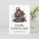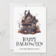 Belle carte d'Halloween avec une maison hantée et des citrouilles. Personnalisez facilement cette carte d'Halloween aquarelle avec votre nom de famille et votre texte.