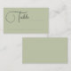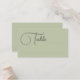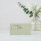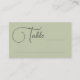 Jolies cartes d'escorte mariage plat en vert olive avec table écrite dans un joli script avec un grand T. Écrire le numéro de table et le nom à la main.