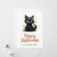 Bonne carte Halloween avec une aquarelle illustrant un chat noir. Personnalisez facilement cette jolie carte d'Halloween pour les enfants avec votre nom de famille et texte.