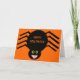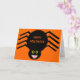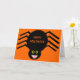 Une araignée noire éffrayante avec huit pattes poilues, des yeux jaunes avec de grands élèves noirs et sa bouche ouverte montrant ses crocs. Cette carte d'Halloween à l'araignée effrayante a un arrière - plan orange.
