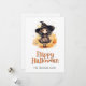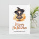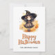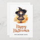Bonne carte Halloween avec une aquarelle illustrant une petite sorcière dans un casquette, citrouilles et fantômes. Personnalisez facilement cette jolie carte d'Halloween pour les enfants avec votre nom de famille et texte.