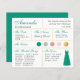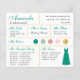 Une carte d'information de demoiselle d'honneur pour un mariage vert émeraude et or, incluant des informations sur la date et l'emplacement du mariage, les couleurs du mariage, la fête de la mariée, la robe de demoiselle d'honneur et un message de proposition de la demoiselle d'honneur. Le nom de la demoiselle d'honneur et les titres sont écrits dans un texte vert élégant. Dans le coin inférieur droit, il y a une robe vert émeraude. Au centre, il y a les couleurs mariages en cercles. Les couleurs, y compris la couleur de la robe mariage, peuvent être changées, à l'exception du cercle or, qui est fausse feuille d'or. Les couleurs par défaut sont le vert, le rose et l'or. Le dos est vert émeraude, comme la couleur de la robe de demoiselle d'honneur.