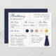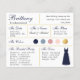 Une carte d'information de femme de ménage bleu marine et or, comprenant des informations sur la date et l'emplacement du mariage, les couleurs du mariage, la fête de la mariée, la robe de femme de ménage et un message de proposition de femme de ménage. Le nom de la servante d'accueil et les titres sont écrits dans une écriture élégante bleu marine. Dans le coin inférieur droit, il y a une robe bleu marine. Au centre, il y a les couleurs mariages en cercles. Les couleurs, y compris la couleur de la robe mariage, peuvent être changées, à l'exception du cercle or, qui est fausse feuille d'or. Les couleurs par défaut sont bleu marine, bleu poussiéreux, rose poussiéreux, rose roux et or.