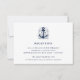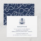 La carte d'information de réception de style côtier présente les détails de votre réception de mariage en bleu marine, accentués d'une illustration d'une ancre de navire dessinée à la main avec vos initiales nichées à l'intérieur. Les cartes sont à l'envers sur un motif de corde nautique en boucle en blanc sur fond bleu marine. Conçu pour correspondre à notre collection de faire-part de mariage Well Anchored.