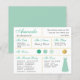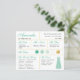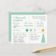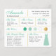 Une carte d'information pour demoiselle d'honneur pour un mariage de couleur menthe et or, comprenant des informations sur la date et le lieu du mariage, les couleurs du mariage, le cortège nuptial, la robe de demoiselle d'honneur et un message de demande de demoiselle d'honneur. Le nom de la demoiselle d'honneur et les titres sont écrits dans une belle écriture de couleur menthe foncé. Dans le coin inférieur droit, il y a une robe menthe. Au centre, se trouvent les couleurs du mariage dans des cercles. Les couleurs, y compris la couleur de la robe de mariée, peuvent être modifiées, à l'exception du cercle doré, qui est en faux or. Les couleurs par défaut sont trois nuances de menthe, blanc et or. Le dos est de couleur menthe clair comme la couleur de la robe de demoiselle d'honneur.