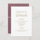 Carte d'information simple, élégante, minimaliste or et blanc mariage en combinaison avec le beau côté pourpre de raisin avec coeur de corde en feuille d'or. Adorable, moderne, classe, unique carte Détails Mariage.