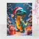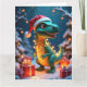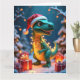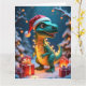 Un dinosaure ludique portant un chapeau de Père Noël et enveloppé de lampes en papier se dresse parmi les cadeaux et les lanternes brillantes dans ce design d'art en papier 3D. Une idée de carte de vacances amusante et décalée pour tous les âges.