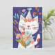 Un chat souriant et heureux fête, porte un casquette de fête et tient un bouquet de fleurs.