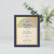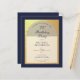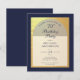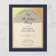 Une invitation d'anniversaire moderne. Sur un fond rectangulaire bleu marine, il y a un arc en faux or avec à l'intérieur du texte bleu marine sur fond blanc. Les mots Birthday Party sont écrits dans une élégante écriture calligraphique ; la première ligne est un texte arqué.