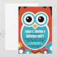 Carte d'invitation d'anniversaire pour enfants avec dessin animé de chouette mignon et décoration de fleurs. Vous pouvez également personnaliser le texte pour d'autres occasions comme une douche de mariage, une invitation de mariage, une invitation à une baby shower ou une invitation à une fête prénatale.