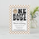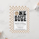 Carte d'invitation pour le 1er anniversaire de One Happy Dude. Fond à carreaux beige et accents noirs
