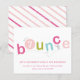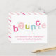 Cette invitation d'anniversaire bounce présente des lettres sautillantes dans une palette de couleurs girly de rose chaud, rose clair, vert citron et aqua avec l'âge modifiable dans le O. Une prise super amusante et extra girly sur un trampoline, une gymnastique ou une fête bounce house. Cette invitation est inspirée par toutes les petites filles qui aiment sauter, rebondir et voler. Cliquez sur modifier pour personnaliser.