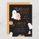Carte d'invitation d'anniversaire sur le thème d'Halloween en noir, orange et violet. Avec des fantômes mignons, des chauves-souris, une citrouille et une typographie amusante. Personnalisée avec le nom, l'âge et les détails de la fête.