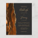 Économisez le coût d'impression et d'envoi de cartes RSVP séparées avec cette élégante invitation de mariage moderne et économique tout-en-un. Le bord gauche présente une bordure d'agate aquarelle orange brûlé et rouille taillée avec de fausses paillettes dorées. Le texte personnalisable combine des polices dorées manuscrites, copperplate et italiques sur un fond noir ardoise. Le verso offre un espace pour les détails du mariage sur un fond noir ardoise uni, ainsi qu'un code QR que les invités peuvent scanner pour visiter votre site web et répondre.